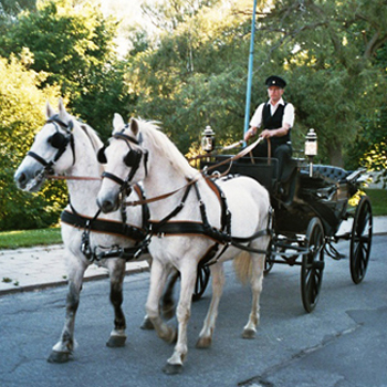 med häst och vagn. Kusken som kör er berättar gärna lite historia runt de