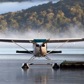 Kliv från bryggan in i planet som vackert guppar i vattnet. Piloten ger